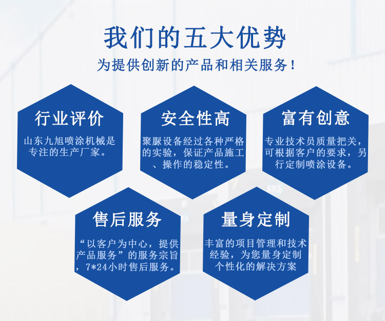 目前山東九旭機(jī)械設(shè)備已領(lǐng)跑中國液壓聚脲設(shè)備行業(yè),價(jià)格合理成為廣大客戶之首選。液壓聚脲噴涂機(jī)廠家所銷售產(chǎn)品主要來自國內(nèi)及國際知名品牌,產(chǎn)品性能優(yōu)良,價(jià)格合理,專業(yè)的技術(shù)和完善的售后服務(wù)贏得國內(nèi)外眾多客戶的誠摯贊賞........